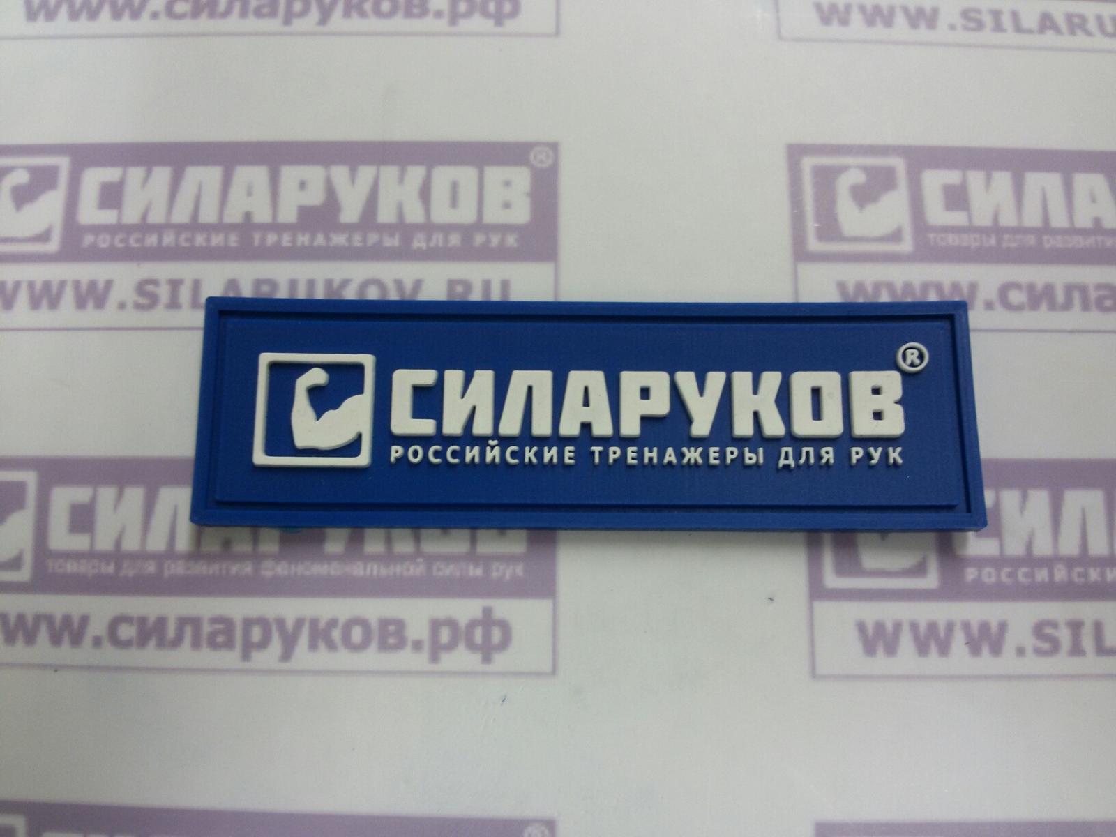 Нашивка  СИЛАРУКОВ с логотипом и названием компании белого цвета на синем фоне в форме прямоугольника.